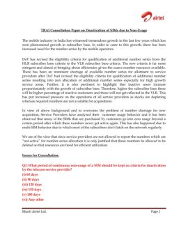 Bharti Airtel Ltd. Page 1 TRAI Consultation Paper on Deactivation of SIMs due to Non-Usage The mobile industry in India has witnessed tremendous growth in the last ...