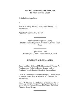 THE STATE OF SOUTH CAROLINA In The Supreme Court Erika Fabian, Appellant, v. Ross M. Lindsay, III and Lindsay and Lindsay, LLC, Respondents. Appellate Case No. 2012 ...