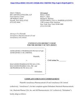 2 THE PARTIES 1. Plaintiff AstraZeneca Pharmaceuticals LP is a limited partnership organized under the laws of Delaware, having its principal place of business at ...