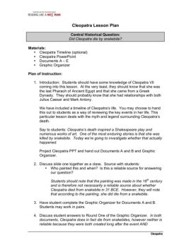 Cleopatra Cleopatra Lesson Plan Central Historical Question: Did Cleopatra die by snakebite? Materials: • Cleopatra Timeline (optional) • Cleopatra PowerPoint