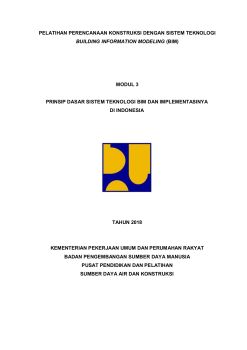 Modul 3 yang membahas mengenai “Prinsip Dasar Sistem Teknologi BIM dan Impelementasinya di Indonesia” diharapkan menambah wawasan dan pengetahuan peserta pelatihan Perencanaan Konstruksi dengan Sistem Teknologi Building Information Modeling (BIM) mengenai keterkaitan Prinsip Dasar Sistem Teknologi BIM dengan Perencanaan Konstruksi dengan Sistem Teknologi Building Information Modeling (BIM). Selain itu diharapkan peserta pelatihan dapat menggali keluasan dan kedalaman substansinya bersama sesama peserta dan para Widyaiswara dalam berbagai kegiatan pembelajaran selama pelatihan berlangsung