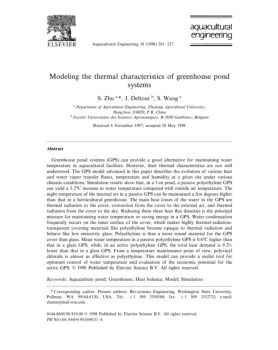 Aquacultural Engineering 18 (1998) 201–217 Modeling the thermal characteristics of greenhouse pond systems S. Zhu a,*, J. Deltour b, S. Wang a a Department of ...