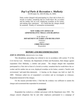 Dep’t of Parks & Recreation v. Mullusky ... displaying swastikas on his locker, and making false statements. ALJ found that the charges should be sustained.