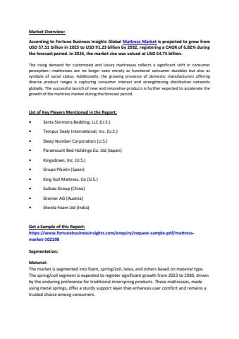 According to Fortune Business Insights Global Mattress Market is projected to grow from USD 57.51 billion in 2025 to USD 91.23 billion by 2032, registering a CAGR of 6.82% during the forecast period. In 2024, the market size was valued at USD 54.75 billion.