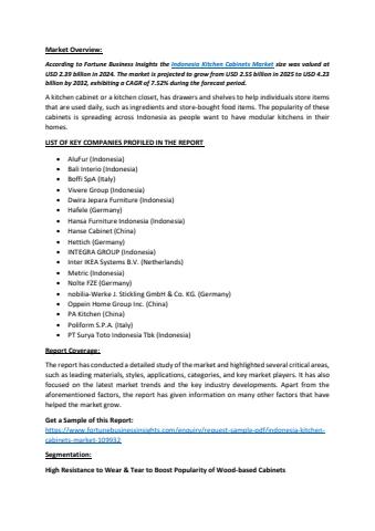 According to Fortune Business Insights the Indonesia Kitchen Cabinets Market size was valued at USD 2.39 billion in 2024. The market is projected to grow from USD 2.55 billion in 2025 to USD 4.23 billion by 2032, exhibiting a CAGR of 7.52% during the forecast period.