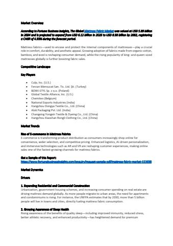 According to Fortune Business Insights, The Global Mattress Fabric Market was valued at USD 5.89 billion in 2024 and is projected to expand from USD 6.12 billion in 2025 to USD 8.58 billion by 2032, registering a CAGR of 4.93% during the forecast period.