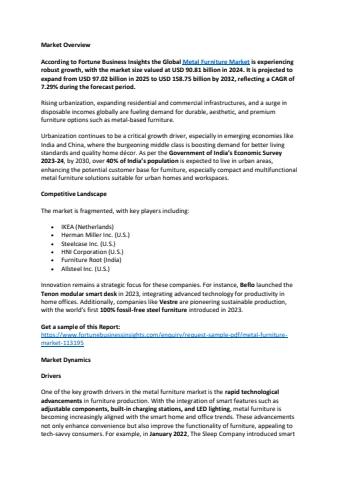 According to Fortune Business Insights the Global Metal Furniture Market is experiencing robust growth, with the market size valued at USD 90.81 billion in 2024. It is projected to expand from USD 97.02 billion in 2025 to USD 158.75 billion by 2032, reflecting a CAGR of 7.29% during the forecast period.