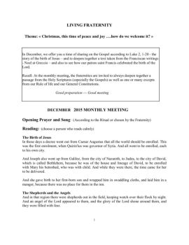 1 LIVING FRATERNITY Theme: « Christmas, this time of peace and joy ….how do we welcome it? » In story of the birth of Jesus DECEMBER 2015 MONTHLY MEETING