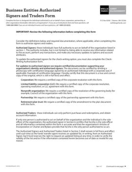 (Continued on next page.) P.O. Box 2 | oston, MA 022 wellsfargofunds.com Page 1 of 5 Business Entities Authorized Signers and Traders Form Complete this form to ...
