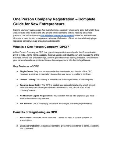 One Person Company Registration can be the perfect start if you're an entrepreneur looking to establish a legitimate and structured business while maintaining complete control. It combines the best of both worlds — the simplicity of a sole proprietorship and the legal protection of a private limited company. With the right guidance and a little effort, you can have your OPC up and running in no time.