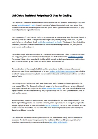 Litti Chokha is a traditional dish from the Indian state of Bihar, and is known for its unique taste and texture best oil to deep fry with. This dish consists of a baked dough ball made from wheat flour, stuffed with a mixture of roasted gram flour and spices, and is typically served with chokha, a spicy mashed potato and vegetable mixture.