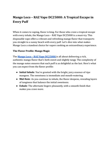 When it comes to vaping, flavor is king. For those who crave a tropical escape with every inhale, the Mango Loco – RAZ Vape DC25000 is a must-try. This disposable vape offers a vibrant and refreshing mango flavor that transports you straight to a sunny beach with every puff. Let's dive into what makes Mango Loco a standout choice for vapers seeking an extraordinary experience.