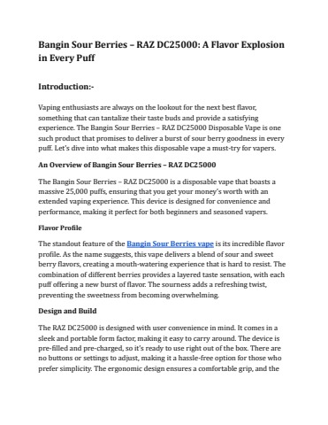 Vaping enthusiasts are always on the lookout for the next best flavor, something that can tantalize their taste buds and provide a satisfying experience. The Bangin Sour Berries – RAZ DC25000 Disposable Vape is one such product that promises to deliver a burst of sour berry goodness in every puff. Let’s dive into what makes this disposable vape a must-try for vapers.