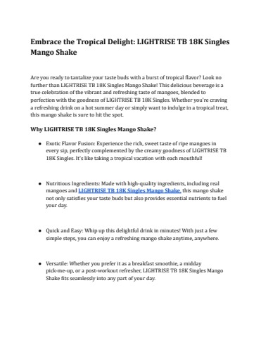 This delicious beverage is a true celebration of the vibrant and refreshing taste of mangoes, blended to perfection with the goodness of LIGHTRISE TB 18K Singles.