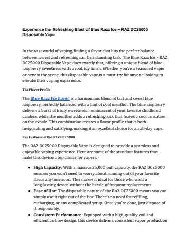 In the ever-evolving world of vaping, flavor innovation and device performance are key to a satisfying experience. Among the myriad of options available, the Blue Razz Ice – RAZ DC25000 Disposable Vape stands out as a remarkable choice for both new and seasoned vapers. This blog post will dive deep into the features, flavor profile, and benefits of this exceptional disposable vape, highlighting why it has become a favorite among vape enthusiasts.
