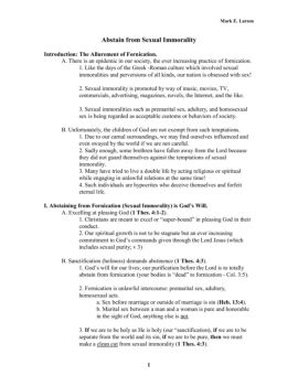 Mark E. Larson 1 Abstain from Sexual Immorality Introduction: The Allurement of Fornication. A. There is an epidemic in our society, the ever increasing practice of ...