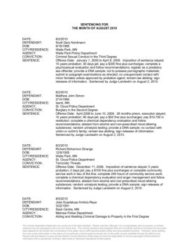 SENTENCING FOR THE MONTH OF AUGUST 2010 DATE: 8/2/2010 DEFENDANT: Scott Gary Nordmann DOB: 9/18/1985 CITY/RESIDENCE: Waite Park, MN AGENCY: Waite Park Police Department