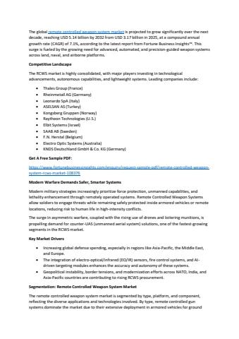 The global remote controlled weapon system market is projected to grow significantly over the next decade, reaching USD 5.14 billion by 2032 from USD 3.17 billion in 2025, at a compound annual growth rate (CAGR) of 7.1%, according to the latest report from Fortune Business Insights™.