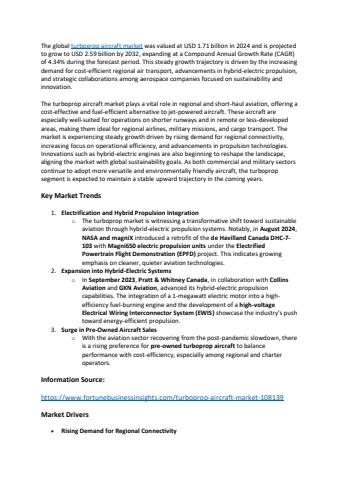 The global turboprop aircraft market was valued at USD 1.71 billion in 2024 and is projected to grow to USD 2.59 billion by 2032, expanding at a Compound Annual Growth Rate (CAGR) of 4.34% during the forecast period. This steady growth trajectory is driven by the increasing demand for cost-efficient regional air transport, advancements in hybrid-electric propulsion, and strategic collaborations among aerospace companies focused on sustainability and innovation.