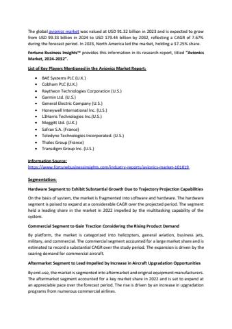 The global avionics market was valued at USD 91.32 billion in 2023 and is projected to grow from USD 99.33 billion in 2024 to USD 179.44 billion by 2032, reflecting a CAGR of 7.67%