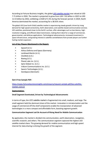According to Fortune Business Insights, the global LEO satellite market was valued at USD 7.71 billion in 2024. The market is projected to grow from USD 7.93 billion in 2025 to USD 11.53 billion by 2032, exhibiting a CAGR of 5.5% during the forecast period. In 2024, North America dominated the market, accounting for a 38.91% share.