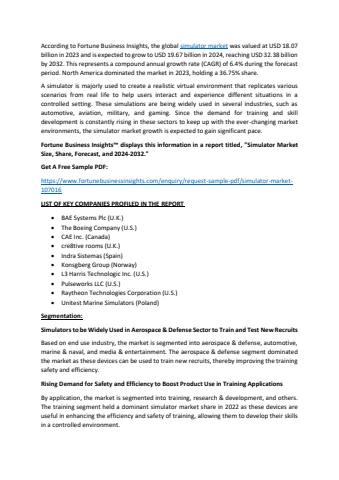 According to Fortune Business Insights, the global simulator market was valued at USD 18.07 billion in 2023 and is expected to grow to USD 19.67 billion in 2024, reaching USD 32.38 billion by 2032. This represents a compound annual growth rate (CAGR) of 6.4% during the forecast period. North America dominated the market in 2023, holding a 36.75% share.