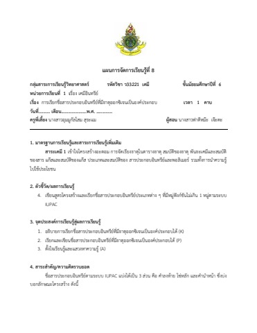 แผนการจัดการเรียนรู้ที่ 8 การเรียกชื่อสารประกอบอินทรีย์ที่มีออกซิเจนเป็นองค์ประกอบ