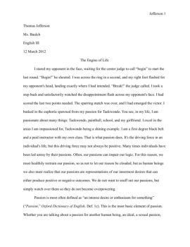 Jefferson 1 Thomas Jefferson Ms. Baulch English III 12 March 2012 The Engine of Life I stared my opponent in the face, waiting for the center judge to call “begin ...