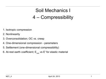 MZ1_4 April 24, 2013 1 Soil Mechanics I 4 – Compressibility 1. Isotropic compression 2. Nonlinearity 3. Overconsolidation; OC vs. creep 4. One-dimensional ...