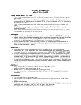 HOPKINS INTRAMURALS VOLLEYBALL RULES 1. TEAM MANAGERS/CAPTAINS: Team managers/captains are responsible for informing their teammates of all Intramurals governing rules