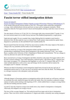 Fascist terror stifled immigration debate Society & Culture[1] Society & Culture[1]immigration [2]Islam [3]media coverage [4]Terrorism [5]Norway [6]Forskning.no [7]