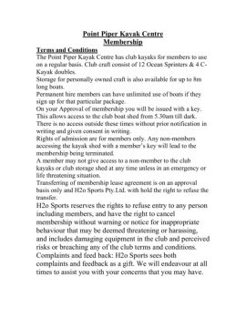 Point Piper Kayak Centre Membership Terms and Conditions The Point Piper Kayak Centre has club kayaks for members to use on a regular basis. Club craft consist of 12 ...