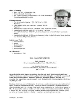 Eisenberg, L. by Cahan E. 1 Leon Eisenberg • Born: 8/8/1922 in Philadelphia, PA • Spouse: Carola B. Eisenberg • A.B. (1944) University of Pennsylvania, M.D ...