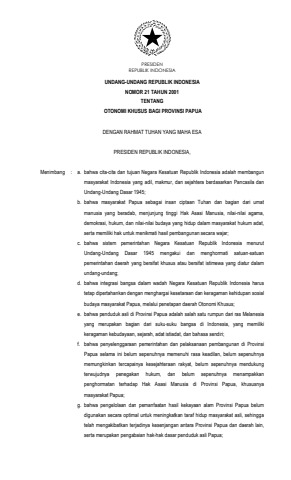 1. UU Nomor 21 Tahun 2001 - Ttg OTONOMI KHUSUS BAGI PROVINSI PAPUA
