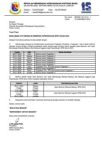 SMK KEPONG BARU: Surat Makluman Cuti Bergilir Peperiksaan SPM 2023_Petang