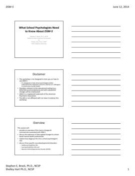 DSM‐5 June 12, 2014 Stephen E, Brock, Ph.D., NCSP Shelley Hart Ph.D., NCSP 1 What School Psychologists Need to Know About DSM‐5