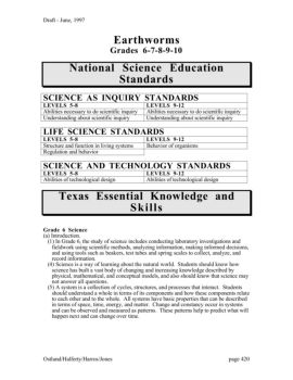 Draft - June, 1997 Ostlund/Halferty/Harros/Jones page 420 Earthworms Grades 6-7-8-9-10 National Science Education Standards SCIENCE AS INQUIRY STANDARDS