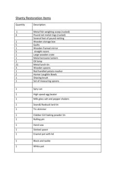Shanty Restoration Items Quantity Description 1 Metal fish weighing scoop (rusted) 4 Pound net metal rings (rusted) Several feet of pound netting