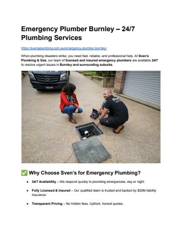 Looking for a reliable emergency plumber in Burnley? Sven’s Plumbing & Gas offers 24/7 plumbing solutions including burst pipes, blocked drains, gas leaks, and hot water repairs. Fast response, upfront pricing, and guaranteed workmanship. Visit https://svensplumbing.com.au/emergency-plumber-burnley/