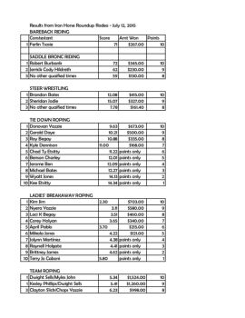 Results from Iron Horse Roundup Rodeo - July 12, 2015 BAREBACK RIDING Constestant Score Amt Won Points 1 Ferlin Tsosie 71 $267.00 10 SADDLE BRONC RIDING