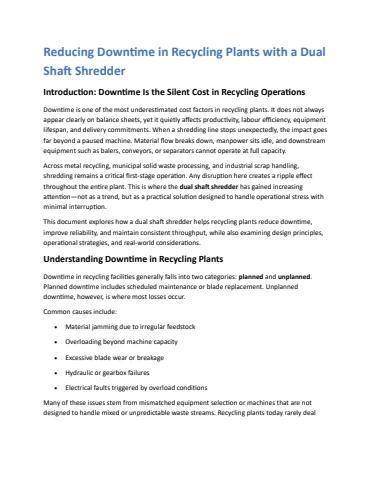 Learn how a dual shaft shredder helps reduce downtime in recycling plants, improving operational efficiency, reliability, and material processing performance.