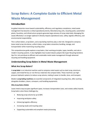 Scrap balers play a vital role in efficient metal waste management. Explore types, benefits, applications, and how scrap baling machines from trusted scrap baler manufacturers in India support sustainable recycling and cost-effective operations with solutions by Super Recycling Solutions Opc Pvt. Ltd.