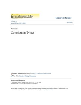 The Iowa Review Volume 42 Issue 3Winter 2012/2013 Article 55 Winter 2012 Contributors' Notes Follow this and additional works at:http://ir.uiowa.edu/iowareview