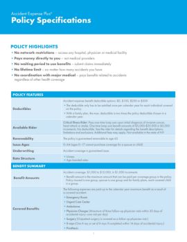 Policy Features Deductibles Accident expense benefit deductible options: $0, $100, $250 or $500 •The deductible only has to be satisfied once per calendar year for ...