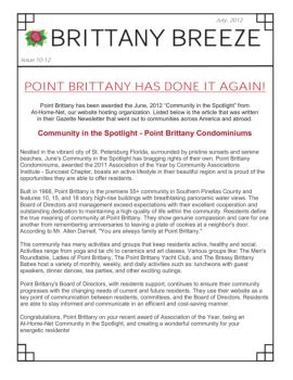 Issue 10-12 July, 2012 BRITTANY BREEZE POINT BRITTANY HAS DONE IT AGAIN! Point Brittany has been awarded the June, 2012 “Community in the Spotlight” from