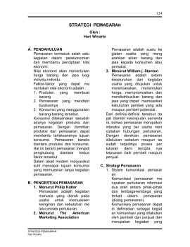strategi pemasaran terdiri dari pola pikir pemasaran yang nantinya dipakai untuk mencapai tujuan pemasaran itu sendiri. Strategi pemasaran berisi strategi rinci tentang sasaran pasar, penetapan posisi, bauran pemasaran (marketing mix), hingga anggaran untuk pemasaran.