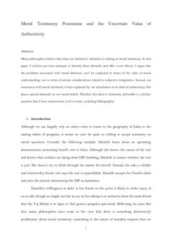 1 Moral Testimony Pessimism and the Uncertain Value of Authenticity Abstract: Many philosophers believe that there are distinctive obstacles to relying on moral ...