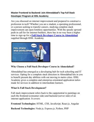 Master the art of web development with IDSL Academy's Full Stack Developer Course in Ahmedabad. This industry-focused program covers front-end, back-end, databases, and deployment using modern technologies like HTML, CSS, JavaScript, React, Node.js, MongoDB, and more. Gain hands-on experience through real-world projects and become job-ready with expert mentorship and placement support. Ideal for beginners and professionals looking to upgrade their skills.