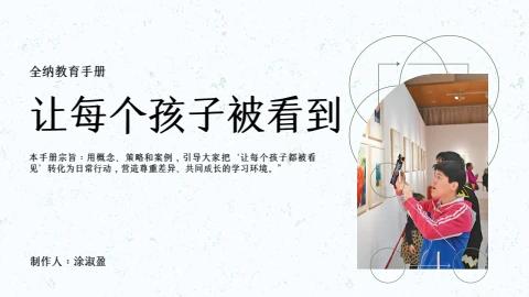 本手册宗旨:用概念、策略和案例,引导大家把‘让每个孩子都被看见’转化为日常行动,营造尊重差异、共同成长的学习环境。”