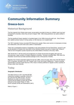 Community Information Summary . Greece-born . Historical Background . The first migrants from Greece were seven young sailors convicted of piracy by a British naval ...